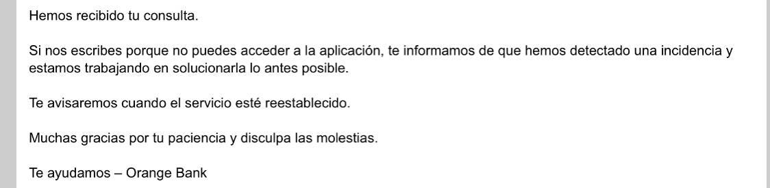 Orange Bank está derivando las quejas en redes al email teayudamos@orangebank.es. Por el momento, todos los clientes consultados manifiestan no haber recibido respuesta a sus emails y dicen haber recibido solo la siguiente respuesta automática: